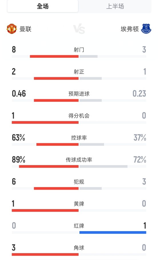 2025-11-25 08:05:08曼联半场0-1埃弗顿:射门8-3,射正2-1,控球率63%-37%,红牌0-1